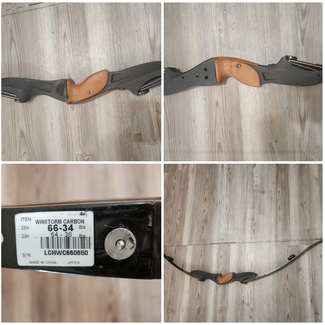 17" Samick Discovery riser with Winstorm Carbon limbs making a 58" bow. Draw weight is currently 37# @ 28". Limb bolts are not all the way down and will make approx 40# . Original owner replaced grip with leather for a larger and warmer grip. Shoots very nice and quiet.